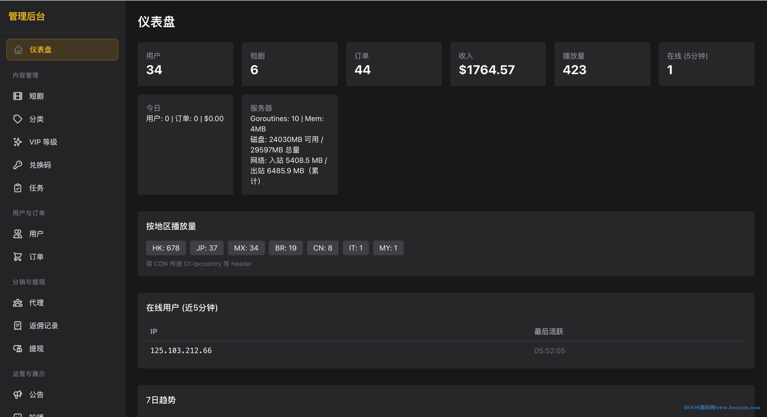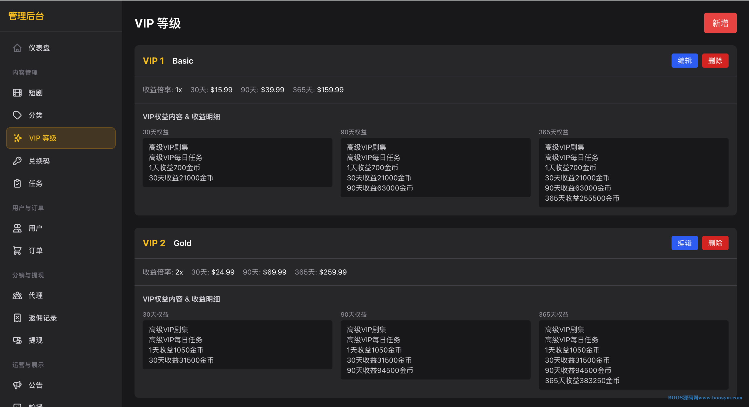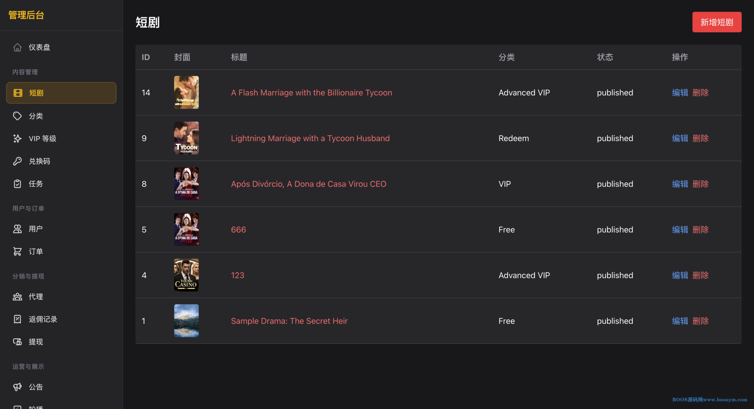 **管理后台**:仪表盘、短剧/剧集/分类/VIP/兑换码/任务 CRUD、用户与订单管理、代理与提现审核、公告轮播、管理员与操作日志、系统设置(含 GLPay/PayBao 配置、R2/OSS 存储)