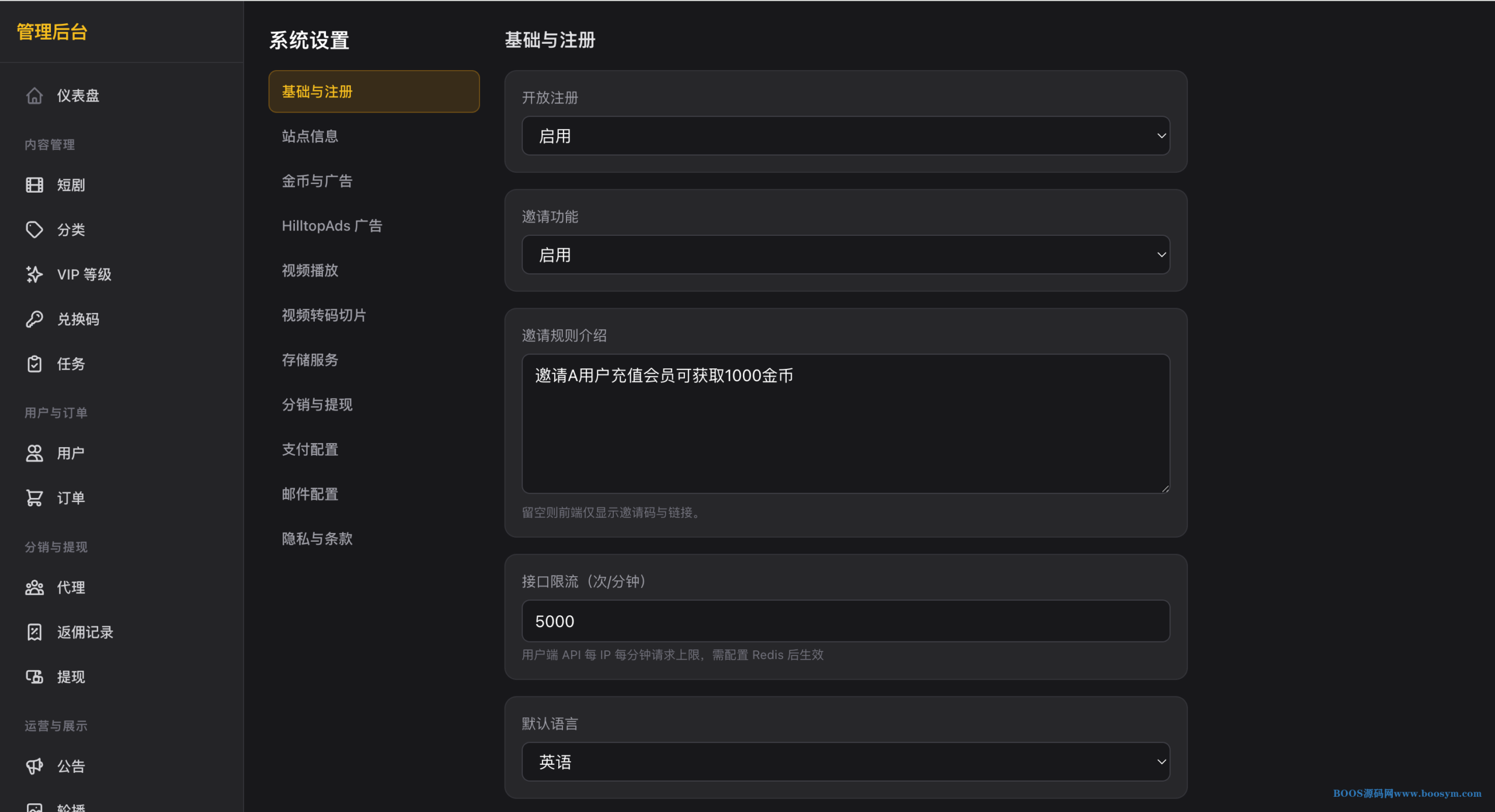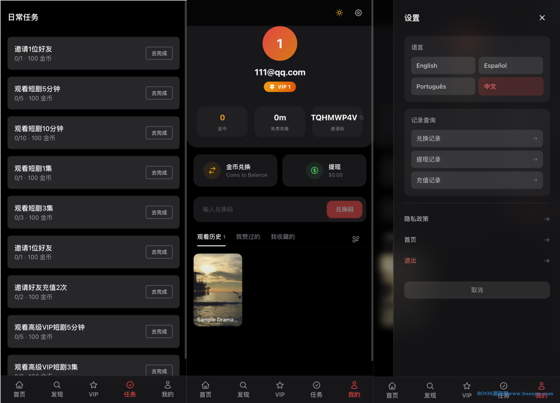 **用户端**:邮箱注册/登录、密码找回、首页视频流、短剧列表与分类、VIP 购买(多通道按货币选择)、刷视频得金币、兑换码、任务、邀请分销、多级返佣、提现(多通道选择)、个人中心、多语言