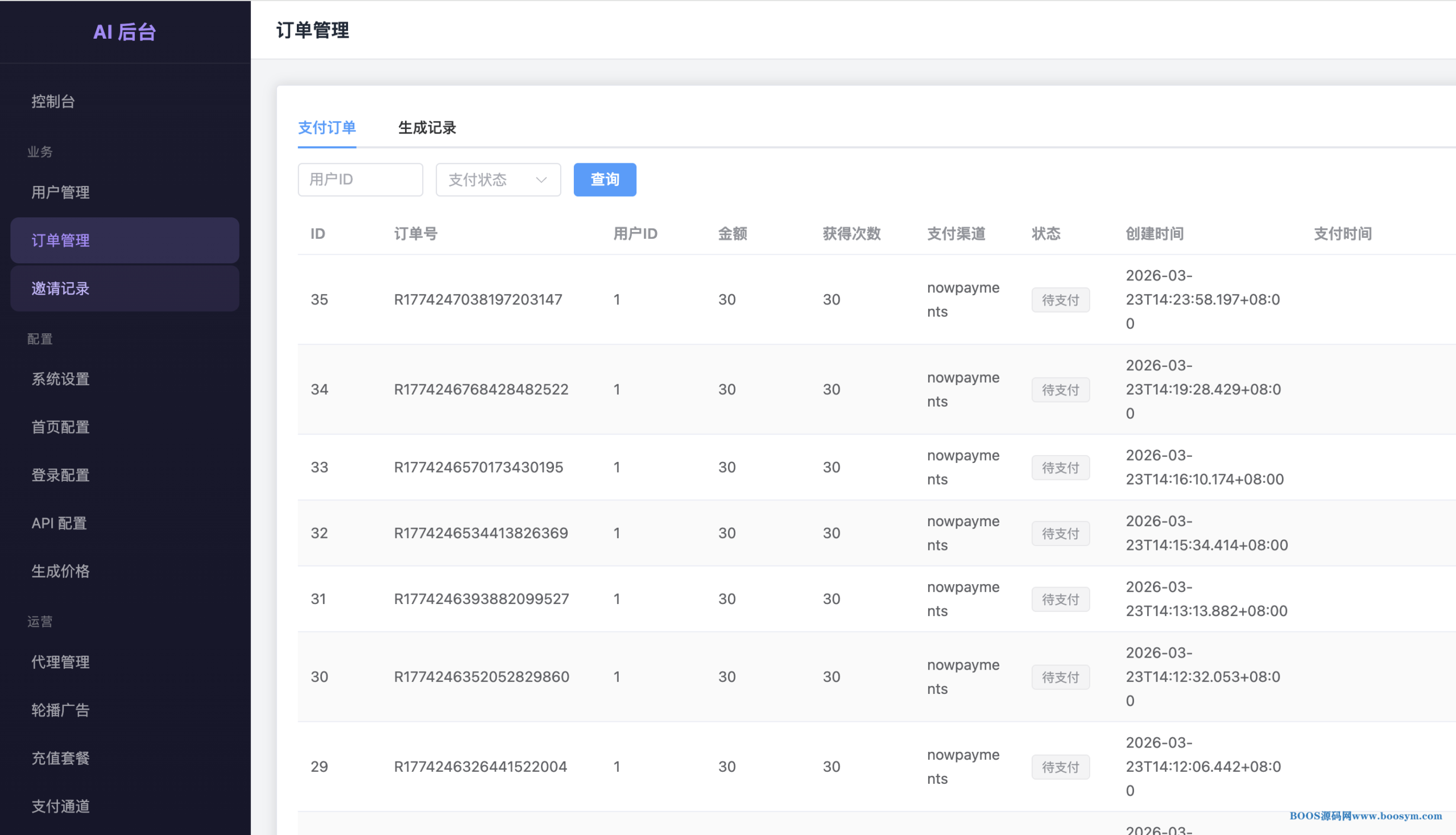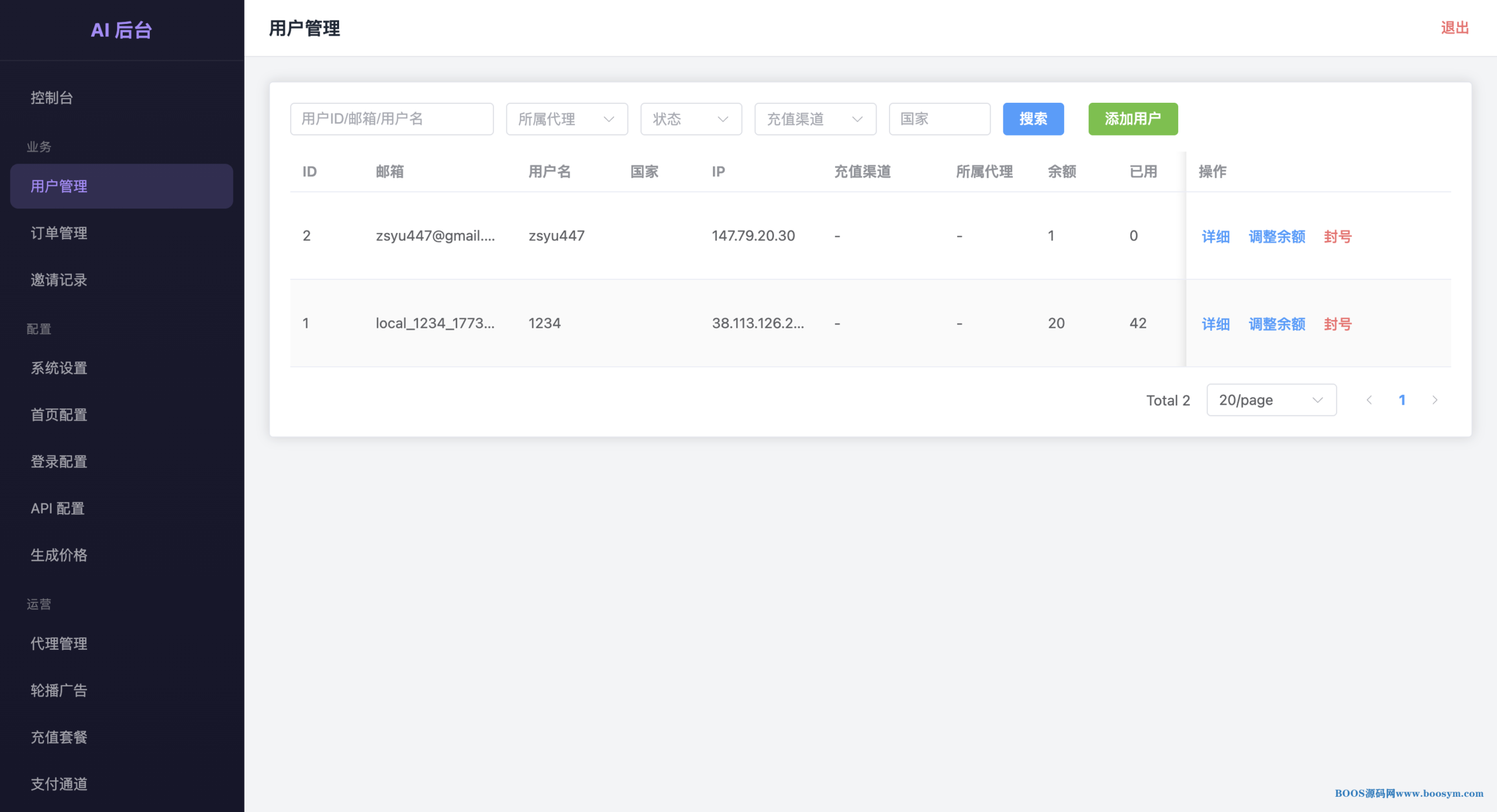 | 订单管理 | 订单列表、状态、用户筛选 |